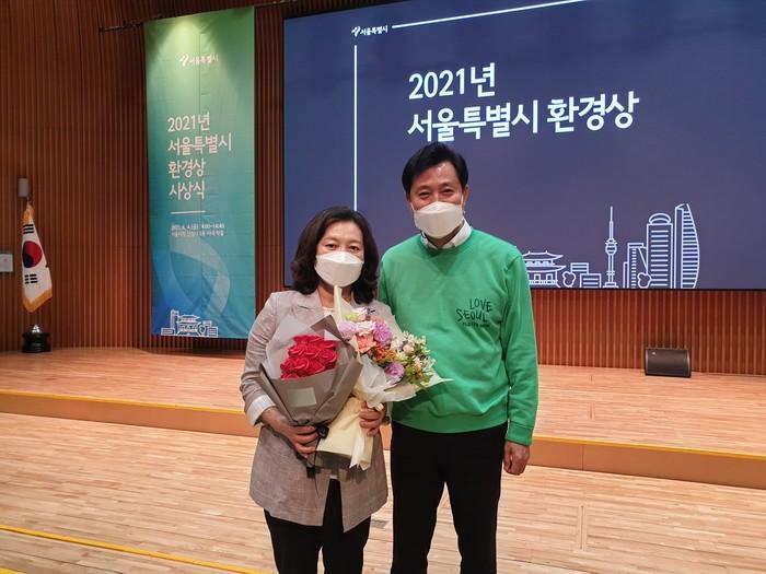 서울 강동구 환경단체인 ‘환경오너시민모임’이 최근 환경교육·환경캠페인 및 전국 최초 민·관 협력 아이스팩 재사용 수거체계 구축사업의 적극적 협력 등을 인정받아 '제25회 서울특별시 환경상 우수상'을 받았다. 사진은 단체 관계자가 오세훈 서울시장(오른쪽)과 기념촬영을 하는 모습. (사진제공=강동구청)