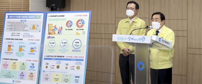 신은호 인천시의장이 20일 공감회의실에서 열린 ‘코로나19 인천형 민생경제 지원대책’ 입장 발표에서 시 정부와 협력해 안전한 백신 접종으로 국민을 지켜내고 민생경제 회복을 위해 총력을 다하겠다고 말했다. 사진은 입장을 발표하고 있는 신 의장의 모습. (사진제공=인천시의장)