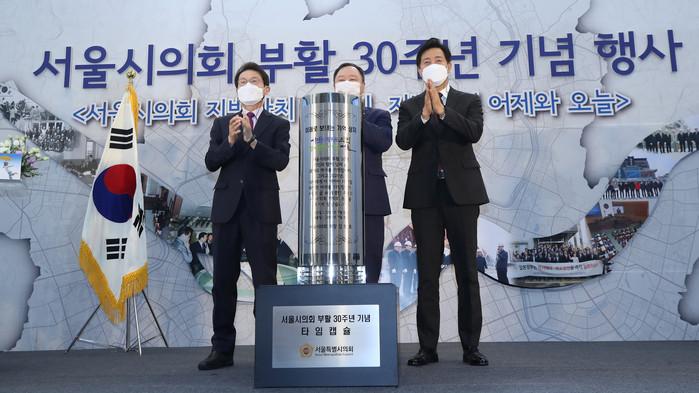 최근 서울시의회 의사당에서 열린 지방자치부활 30주년 기념식 참석자들이 타임캡슐 봉인식을 하고 있다. 왼쪽부터 조희연 서울시교육감, 김인호 서울시의회 의장, 오세훈 서울시장.