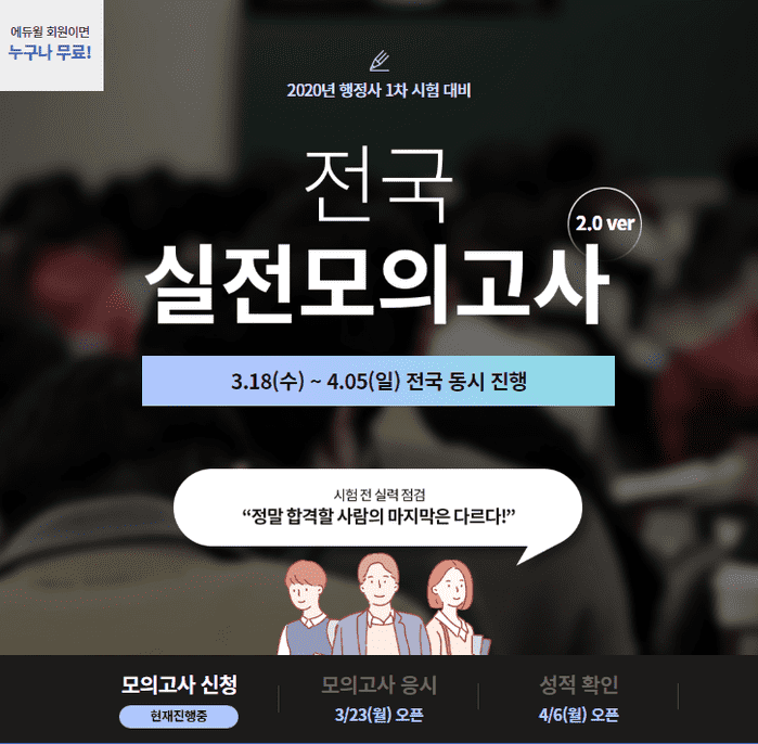 행정사 온라인모의고사는 18일부터 4월5일까지 신청 접수를 진행할 예정이며, 에듀윌 회원이라면 누구나 무료로 응시할 수 있다. 성적 통계 확인은 4월 6일 오후 2시 이후로 확인할 수 있다.