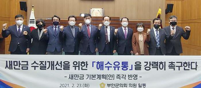 전북 부안군의회가 새만금위원회 회의를 앞두고 새만금 해수 유통 촉구 건의문을 만장일치로 채택했다. 사진은 23일 새만금 해수 유통 등을 촉구하는 부안군의원들.