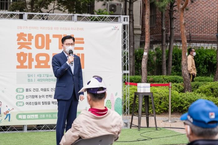 서울 강동구는 27일 코로나19로 문화활동 등을 즐기지 못한 노인들을 위해 마련한 소규모 문화공연인 ‘찾아가는 화요무대’를 개최해 마술쇼·봄맞이 음악공연 등을 선보였다. 사진은 화요무대에 참석한 이정훈 구청장이 인사말을 하고 있는 모습. (사진제공=강동구청)