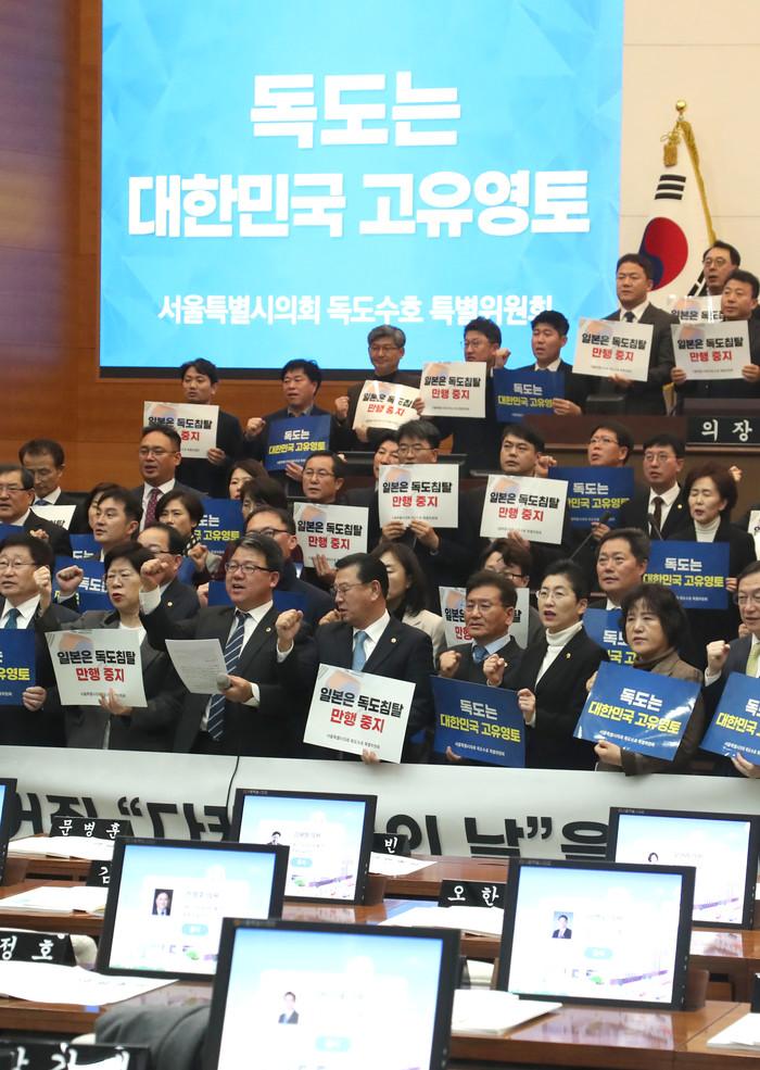 지난 21일 서울시의회에서 독도 수호 특별위원회와 더불어민주당 의원들이 '일본 다케시마의 날 철회'를 요구하는 구호를 외치고 있다.