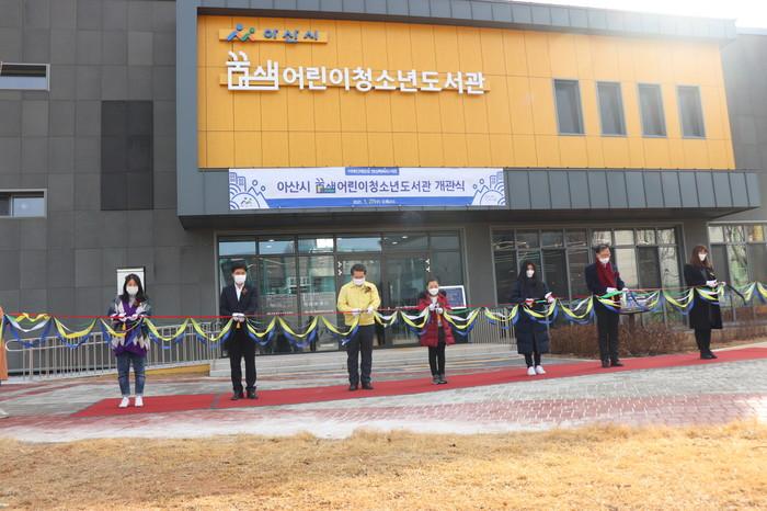 충남 아산시가 최근 ‘꿈샘 어린이청소년도서관’의 개관식을 열었다. 도서관은 아산문화공원내 지상 2층·1815㎡ 규모로 자연친화적 건축공법으로 시공됐으며, 영상분야 특화도서관으로 운영된다. 사진은 개관식에서 오세현 시장(왼쪽에서 세 번째)과 관계자들이 테이프 커팅을 하고 있는 모습. (사진제공=아산시청)