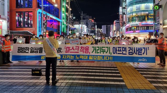 서울 마포구는 지난 2일 홍대 주변 업소에서 확진자가 다수 발생하고 있는 상황에 대한 조치로 홍대 KT&G 상상마당 앞에서 인근의 음식점과 공원·골목 등을 방문해 코로나19 방역지침 준수를 독려하는 캠페인을 전개했다. 사진은 방역지침 준수 캠페인을 실시하는 모습. (사진제공=마포구청)