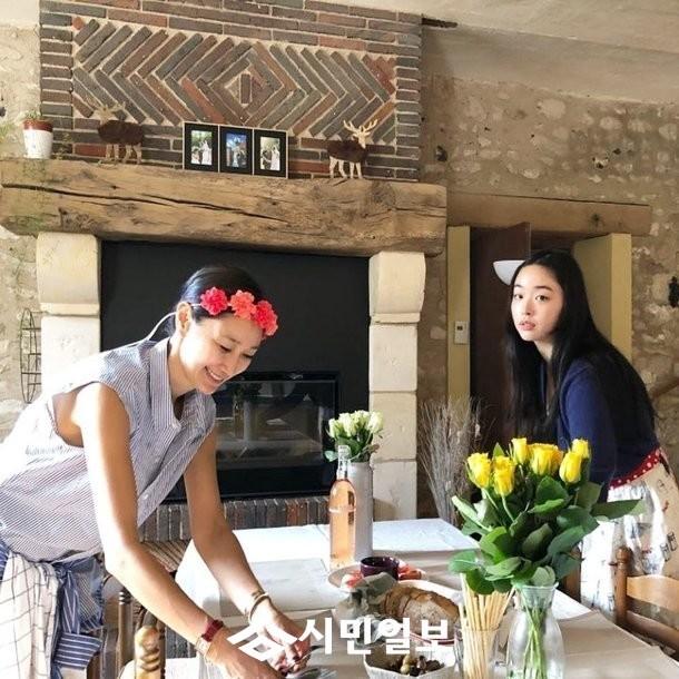 공개된 사진 속 변정수는 화려한 화관을 쓴 채 딸 유채원과 요리를 하고 있다.