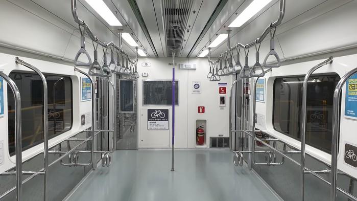 내달 1일부터 서울지하철 7호선 승객은 평일에도 자전거를 휴대하고 전동차를 탈 수 있게 된다고 서울시가 31일 밝혔다. 시는 오는 10월31일까지 2개월간 7호선에서 '지하철 자전거 평일 휴대 승차' 시범운영을 한다. 다만 시간대는 오전 10시부터 오후 4시까지이며, 혼잡도가 높은 출퇴근 시간대는 제외된다. 사진은 자전거 거치대가 설치된 서울지하철 전동차.