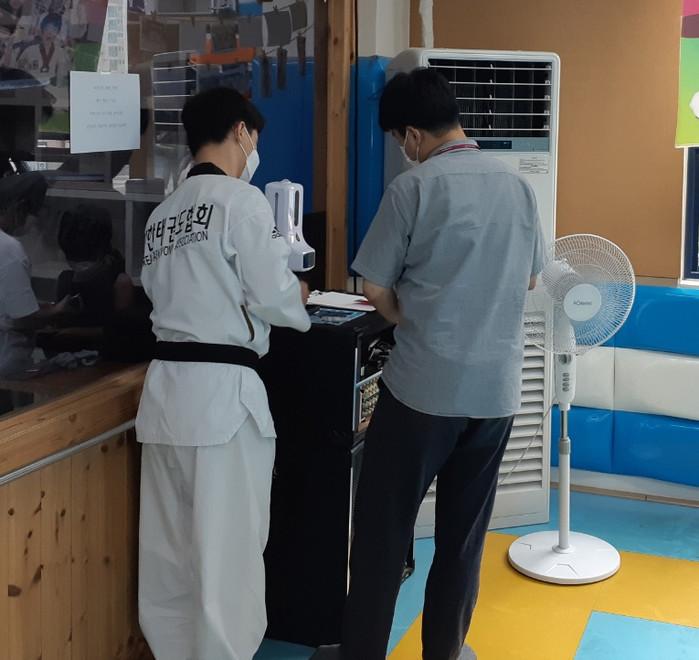 경기 동두천시는 최근 지역내 체육도장에서 코로나19 집단감염이 발생함에 따라 최근 해당 체육시설 27곳 전체에 대해 특별방역점검을 실시했다. 시는 발열체크, 명부작성 등 체육도장 수칙에 대해 준수사항 여부를 집중 점검했다. 사진은 시 관계자가 태권도장에서 특별방역점검을 하고 있는 모습. (사진제공=동두천시청)