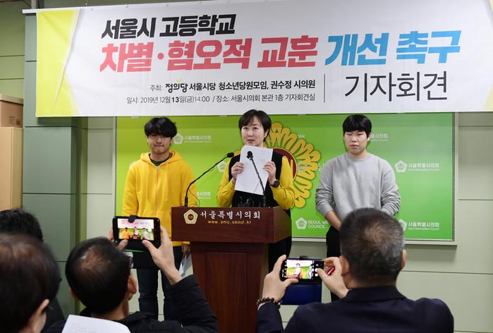 권수정 서울시의원은 최근 서울시의회 브리핑룸에서 일부 학교내 교훈이 차별적이고 혐오적인 내용을 담고 있다며 개선을 촉구하는 기자회견을 열었다. 정의당 서울시당 청소년당원모임이 조사한 결과 서울 소재 326개교 가운데 17개교에서 이 같은 문제점이 드러났다. (사진제공=서울시의회)