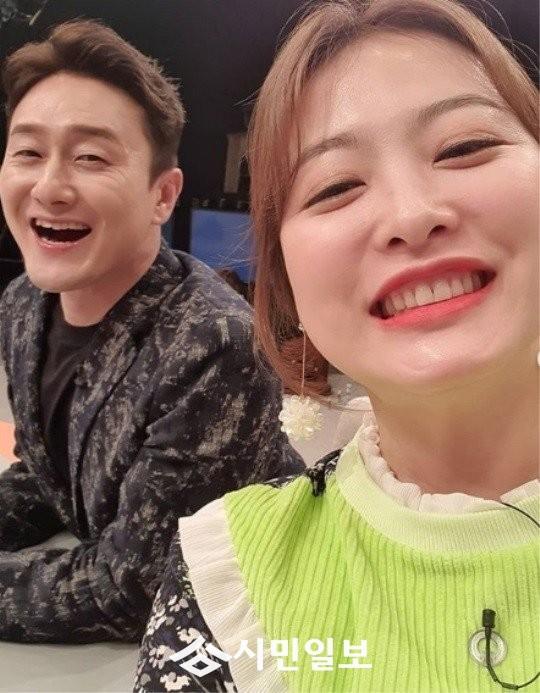 공개된 사진 속 심진화는 남편 김원효와 함께 방송 녹화를 하는 모습이 담겨있다.
