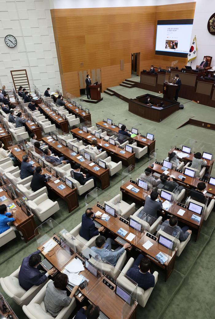 오세훈 서울시장이 29일 서울시의회에서 열린 제301회 정례회 제2차 본회의 시정질문에서 더불어민주당 서윤기 서울시의원의 질의에 답변하고 있다.