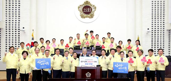인천시의회는 17일 코로나19로 어려움을 겪고 있는 대구·경북지역 피해지원을 위해 자발적으로 모금한 성금을 인천사회복지공동모금회를 통해 전달했다. 사진은 성금전달식에서 대구·경북지역 주민들을 응원하는 메시지를 담은 피켓을 들고 기념촬영을 하는 관계자들의 모습. (사진제공=인천시의회)