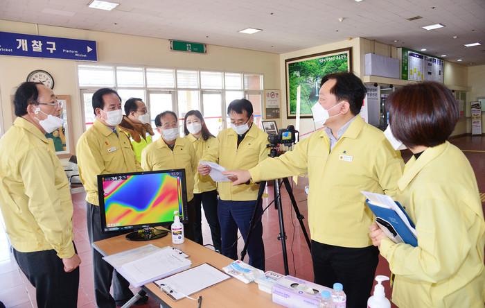 울산시의회 황세영 의장을 비롯한 의원들이 최근 울주군 KTX울산역과 남구 고속시외버스 터미널을 방문해 코로나19(우한폐렴) 확산 방지를 위한 대응상황에 대한 현장 점검을 진행했다. 사진은 열화상카메라 운영 현황을 확인하는 의원들의 모습. (사진제공=울산시의회)