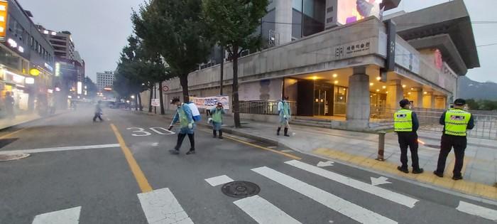 서울 종로구가 최근 개천절 집회로 많은 사람들이 모인 광화문광장, 종각역, 경복궁역, 교보빌딩, 서울역사박물관 등 주요 장소의 방역과 물청소를 실시했다. 사진은 세종문화회관 일대를 방역하고 있는 종로구 방역단의 모습. (사진제공=종로구청)