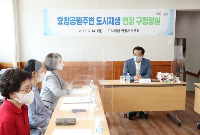 성장현 서울 용산구청장이 14일 2021년 찾아가는 현장 구청장실 일환으로 주민들과 효창공원앞역 테마역사화·효창원로 상징가로 조성 등을 주요 내용으로 ‘효창공원 일대 도시재생사업’ 간담회를 열었다. 사진은 간담회에서 성장현 구청장(오른쪽)이 주민들과 대화를 나누고 있는 모습. (사진제공=용산구청)