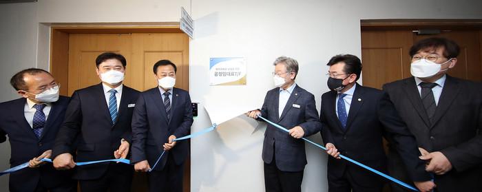 경기도의회가 25일 '위기극복과 상생을 위한 공정임대료 TF 현판식'을 개최했다. 공정임대료 TF는 정부 정책기조에 맞춰 도에서 어려움에 처한 임차인에게 맞춤형 지원대책을 마련하기 위해 출범한 전담기구다. 이날 현판식은 장현국 의장을 비롯해 이재명 도지사, 이상백 도소상공인연합회장 등 관계자들이 참석한 가운데 진행됐다. 사진은 장 의장(오른쪽 세 번째) 및 관계자들이 현판을 걸고 있는 모습. (사진제공=경기도의회)