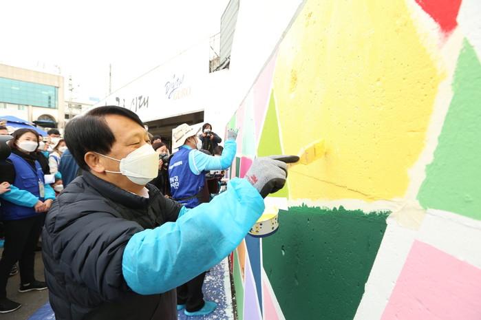 기획재정부 복권위원회가 지난 6일 서울 구로역 공구상가 철길 인근에 70여m의 벽화를 그려 걷고 싶은 거리로 탈바꿈시켰다. 사진은 복권위원회 행복공감 봉사단과 벽화그리기 봉사에 참여한 이성 구로구청장의 모습. (사진제공=구로구청)