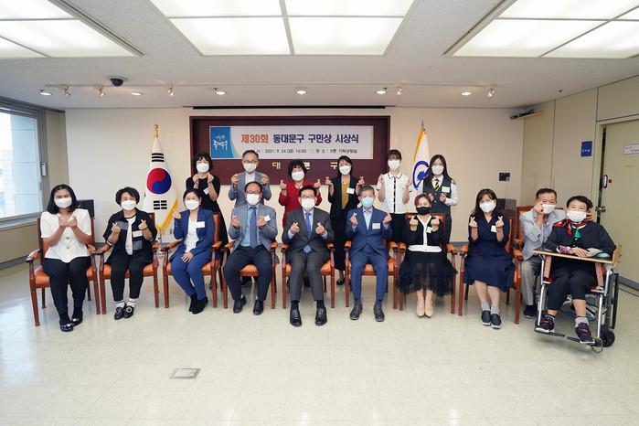 서울 동대문구가 지난 24일 '제30회 동대문구 구민상 시상식'을 개최해 올해의 구민상 수상자로 선정된 14명에 대한 시상을 진행했다. 사진은 이날 시상식에서 유덕열 구청장(앞줄 가운데)과 14명의 구민상 수상자가 기념촬영을 하고 있는 모습. (사진제공=동대문구청)