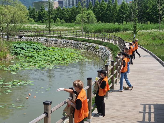경기 하남시 학교밖청소년지원센터 꿈드림 소속 봉사단 ‘꿈나누미’ 청소년들이 최근 하남유니온파크 생태연못을 찾아 수질 개선을 위한 봉사활동에 참여하고 주변 환경정화 활동을 진행했다. 사진은 이날 참여한 청소년들이 직접 만든 EM 흙공을 연못에 던지고 있는 모습. (사진제공=하남시청)