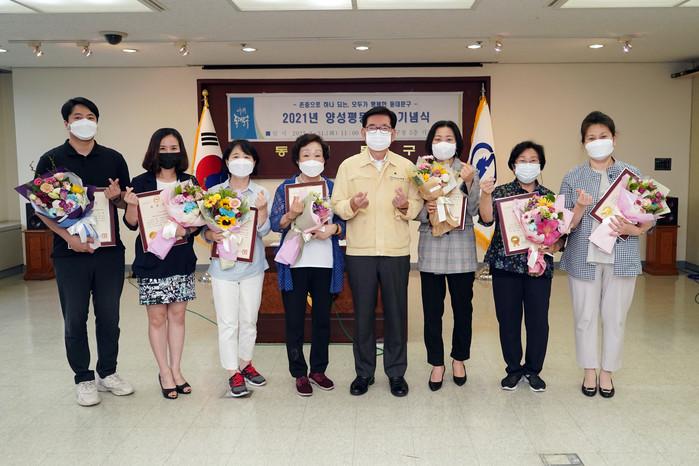 서울 동대문구가 양성평등주간을 맞아 최근 기념식을 개최하고 지난 3일 동대문구청 유튜브를 통해 온라인으로 공개했다. 1부 기념식에서는 양성평등 유공구민 표창 수여식 등이, 2부에서는 유인경 강사 특강을 진행했다. 사진은 유덕열 구청장(가운데)이 양성평등 유공구민 표창 수상자들과 기념촬영을 하는 모습. (사진제공=동대문구청)