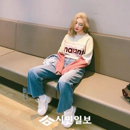 핑크 로고 배색 맨투맨과 와이드 청 팬츠를 완벽하게 소화한 그의 미모가 감탄을 자아낸다.
