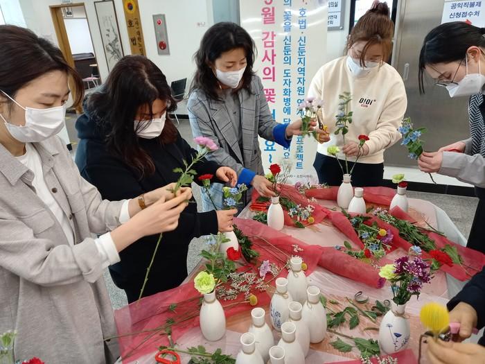 경기 이천시 호법면과 신둔면주민자치위원회에서는 지난 6~7일 '5월에 감사의 꽃 어때요~'라는 주제로 면사무소를 방문하는 민원인을 대상으로 호법의 꽃을 신둔의 도자화병에 꽂는 체험학습의 기회를 진행했다. 사진은 면사무소 방문 민원인들이 화병에 꽃을 꽂는 체험을 하고 있는 모습. (사진제공=이천시청)
