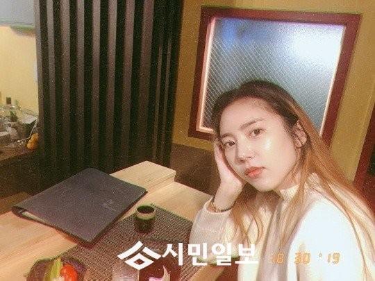 공개된 사진 속 손담비는 한 식당 테이블 앞에 앉아 팔을 괴고 고개를 살짝 돌려 포즈를 취하고 있다.