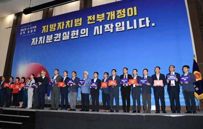 경남도의회 의원들이 지난 19일 열린 영남권 시·도의회 정책토론회에 참석한 가운데 시·도의원들이 피켓을 들고 지방자치법 조속 통과를 촉구하고 있다. (사진제공=경남도의회)