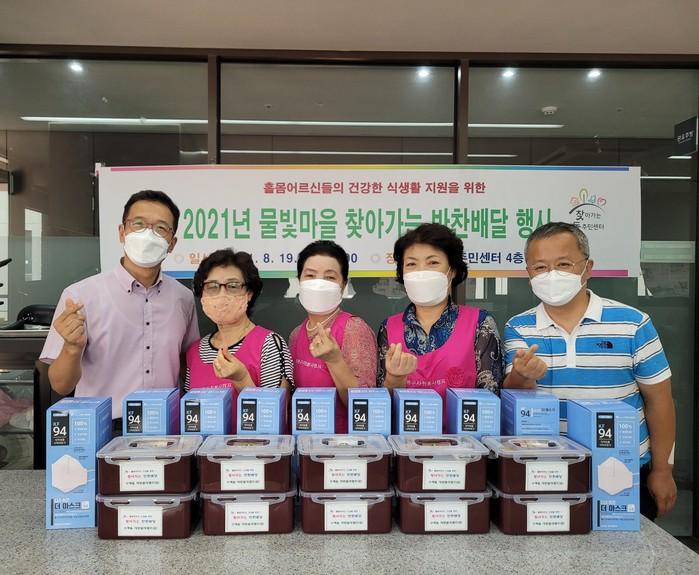 서울 은평구 수색동자원봉사캠프는 최근 ‘물빛마을 찾아가는 반찬배달’ 행사를 실시해 봉사자들이 직접 담근 김치와 마스크를 지역내 취약계층 홀몸노인 가정에 직접 전달했다. 사진은 행사에 참가한 봉사자들이 김경집 수색동장과 기념촬영을 하는 모습. (사진제공=은평구청)