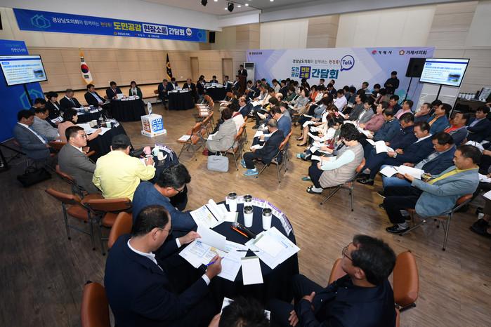 경남도의회는 최근 조선업 침체로 어려운 시기를 보내고 있는 거제시를 방문해 변광용 거제시장, 옥영문 거제시의회 의장 등 120여명이 참석한 가운데 두 번째 '도민 공감 현장소통 간담회'를 개최했다. 사진은 거제시민, 시 관계자들과 소통하는 도의원들의 모습. (사진제공=경남도의회)