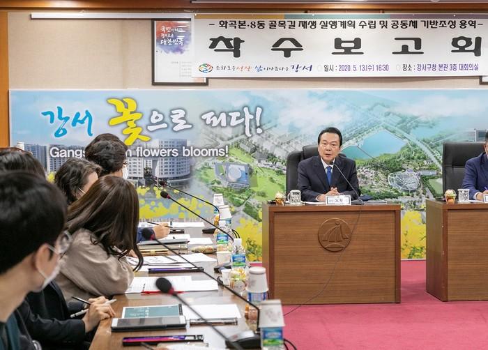 서울 강서구는 13일 구청 대회의실에서 화곡본8동 골목길 재생사업 착수 보고회를 개최했다. 사진은 착수 보고회에 참석한 노현송 구청장(오른쪽)과 사업 관계자들이 골목길 재생사업 진행 상황과 향후 추진 일정에 대해 이야기하는 모습. (사진제공=강서구청)