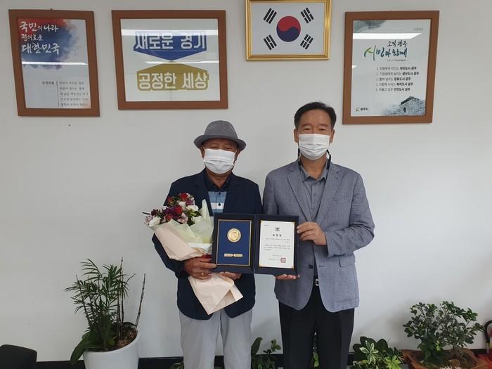 경기 광주시 곤지암읍 새마을협의회 임형동 부회장이 최근 그동안 지역의 발전과 화합에 헌신적으로 봉사해온 공로를 경기도로부터 인정받아 '경기도 선행도민 표창'을 받았다. 사진은 표창 전수식에서 임 부회장이 이용호 곤지암읍장과 기념촬영을 하는 모습. (사진제공=광주시청)