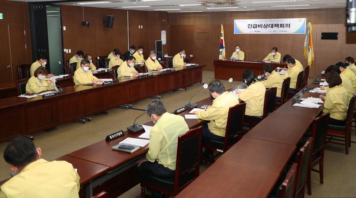 서울 금천구는 지난 27일 코로나19 선제적 방역조치 강화를 위한 ‘긴급비상대책 회의’를 개최해 공직사회 복무관리 강화, 공공시설 및 사회복지시설 운영 검토 등을 논의했다. 사진은 유성훈 구청장(가운데)이 회의를 주재하고 있는 모습. (사진제공=금천구청)