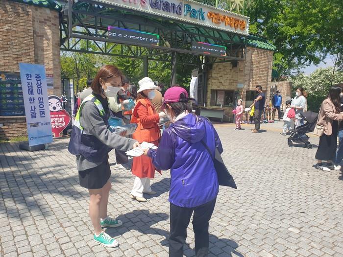 서울 광진구는 5일 코로나19 민·관 합동 특별 방역활동에 나서 나들이객이 몰리는 어린이대공원 정문·후문·구의문과 아차산 입구 등 4곳에서 방역수칙 준수 캠페인을 펼쳤다. 사진은 이날 어린이대공원 후문에서 캠페인을 진행하고 있는 모습. (사진제공=광진구청)
