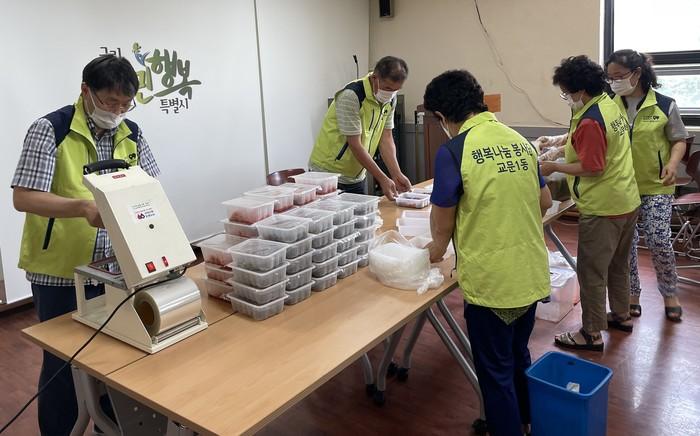 경기 구리시 교문1동은 최근 ‘행복드림 냉장고 사업’을 시작했다. 사업을 통해 결식 우려 대상자와 1인 중장년 가구에 대체식 5종 또는 밑반찬 3종을 월 2회 지원할 예정이다. 사진은 최근 봉사자들이 전달할 밑반찬을 포장하고 있는 모습. (사진제공=구리시청)