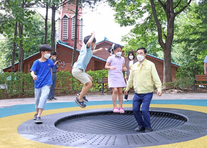 최근 이동진 서울 도봉구청장이 새단장한 누원어린이공원을 방문해 현장을 둘러보고, 공원을 찾은 주민들을 만나 불편함이 없는지를 살폈다. 구는 최근 노후한 누원어린이공원을 정비해 바닥을 포장하고, 아이들이 좋아하는 트램펄린, 짚라인, 놀이언덕 등을 설치했다. 사진은 이 구청장이 어린이들과 함께 트램펄린에서 뛰고 있는 모습. (사진제공=도봉구청)