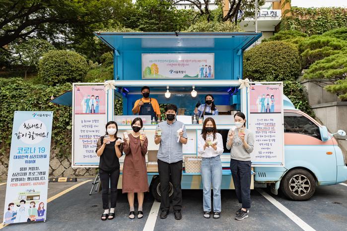 서울 광진구가 28일 ‘힘내요 버스’를 서울시와 공동으로 운영해 코로나19 대응인력을 응원하는 메시지를 전달하고 음료와 다과 등을 제공해 직원들을 격려했다. 사진은 이날 힘내요 버스를 이용하고 있는 직원들이 기념촬영을 하는 모습. (사진제공=광진구청)