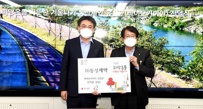 서울 노원구가 8일 (주)동성제약으로부터 '2021 희망온돌 따듯한 겨울나기'의 일환으로 시중에 판매하고 있는 유산균(바이오가이아) 4000매(2억원 상당)를 지역내 저소득층을 위해 사용해 달라며 전달받았다. 사진은 오승록 구청장(왼쪽)이 관계자와 기념촬영을 하는 모습. (사진제공=노원구청)