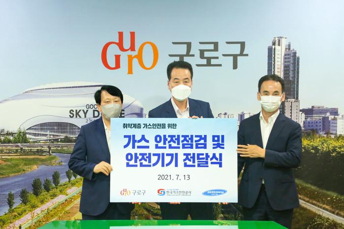 서울 구로구가 13일 한국가스안전공사 서울남부지사·(주)귀뚜라미에너지와 가스 안전점검 및 안전기기 전달식을 진행했다. 이날 행사를 통해 오는 10월까지 지역내 저소득 한부모가정 100여가구에 스마트 가스호스 등 맞춤형 가스 안전기기를 보급·점검키로 했다. 사진은 전달식에서 이성 구청장(왼쪽)과 관계자들이 기념촬영을 하는 모습. (사진제공=구로구청)
