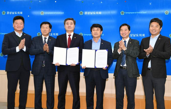 경남도의회 더불어민주당과 자유한국당 원내대표단이 2일 도의회 브리핑룸에서 도청과 도교육청 본예산 예산결산특별위원회 위원장 선출과 관련한 협약서를 체결하고 기념촬영하고 있다.