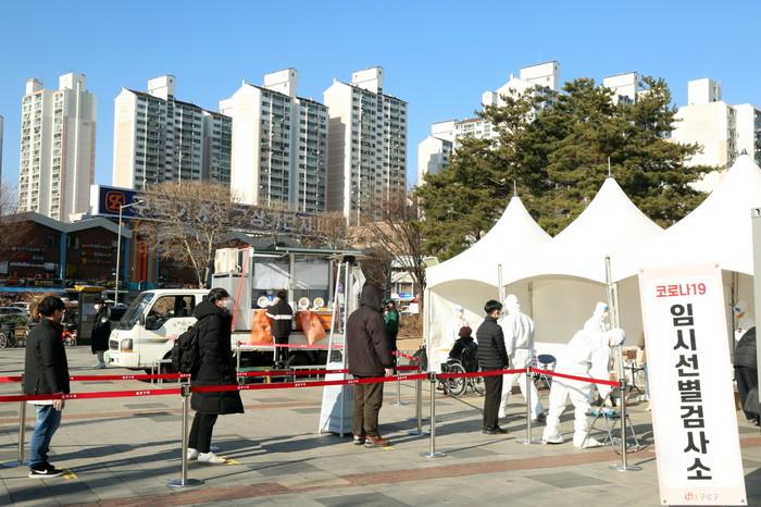 구로구는 구로역 북측광장(3번 출구)에 새로 코로나19 임시 선별검사소를 마련하고 15일부터 운영에 들어갔다. 구로역 임시 선별검사소에서는 증상유무와 관계없이 주민 누구나 무료로 검사를 받을 수 있다. 사진은 주민들이 임시 선별검사소에서 검사를 받기 위해 줄을 서 있는 모습. (사진제공=구로구청)