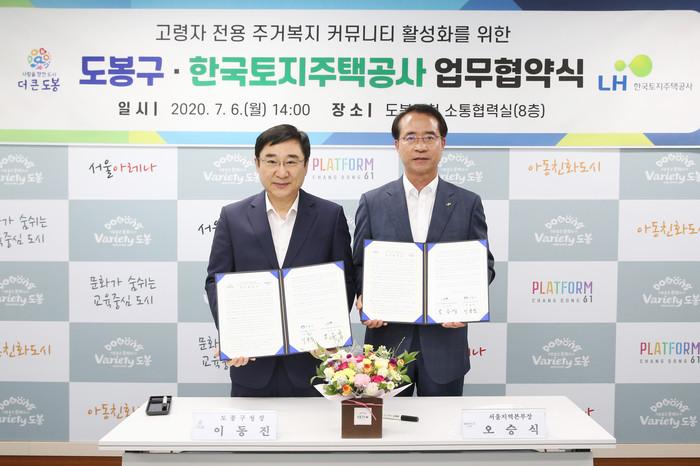 서울 도봉구가 지난 6일 ‘고령자 전용 주거복지 커뮤니티 활성화’를 위해 한국토지주택공사와 업무협약을 했다. 사진은 이동진 구청장(왼쪽)과 오승식 서울지역본부장이 업무협약 후 기념촬영을 하고 있는 모습. (사진제공=도봉구청)