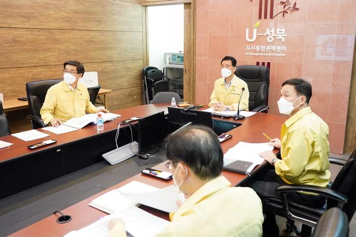 이승로 서울 성북구청장이 13일 교육부총리 주재 ‘대학 긴급 방역점검 영상회의’에 참석했다. 최근 수도권 중심 코로나19 20대 확진자가 급증하는 상황에서 대학과 지자체 간 방역협조체계를 구축, 대학생 백신 접종 독려 등 다양한 대응 방안을 논의했다. 사진은 사진은 대학 긴급 방역 점검회의에 이승로 구청장(가운데)이 참석한 모습. (사진제공=성북구청)
