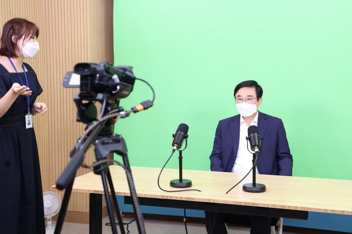 이동진 서울 도봉구청장이 최근 학마을도서관 3층의 유휴공간을 리모델링한 미디어 콘텐츠 창작공유공간 개소 현장을 방문해 시설을 둘러보고 미디어 제작 과정을 체험했다. 사진은 개소 현장을 방문한 이 구청장(오른쪽)이 미디어 제작 과정을 체험하고 있는 모습. (사진제공=도봉구청)