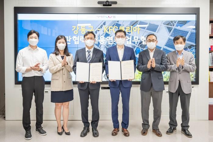 서울 강동구는 29일 KFC코리아와 민·관 협력 채용연계를 위한 업무협약을 체결했다. 협약으로 구는 구직자 모집홍보를 담당하고, KFC코리아는 강동구민을 위한 구직자 채용과정을 진행해 일자리 창출에 협력하기로 했다. 사진은 협약식에서 이정훈 구청장(오른쪽 세 번째)과 관계자들이 기념촬영을 하는 모습. (사진제공=강동구청)