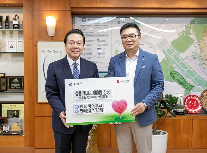 강서구는 최근 구청장실에서 에프지아크스로부터 코로나19 극복을 위한 2000만원 상당의 마스크를 전달받았다. 사진은 노현송 구청장(왼쪽)이 서대엽 에프지아크스 대표이사로부터 마스크를 전달받은 후 함께 기념촬영을 하는 모습. (사진제공=강서구청)
