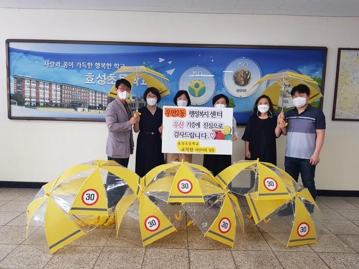 경기 수원시 팔달구 우만2동 지역사회보장협의체는 13일 어린이 빗길 교통사고 방지를 위해 제작한 스쿨존 표시 투명우산 100개를 지역내 효성초등학교에 전달했다. 사진은 전달식에서 관계자들이 스쿨존 표시 우산을 들고 기념촬영을 하는 모습. (사진제공=팔달구청)