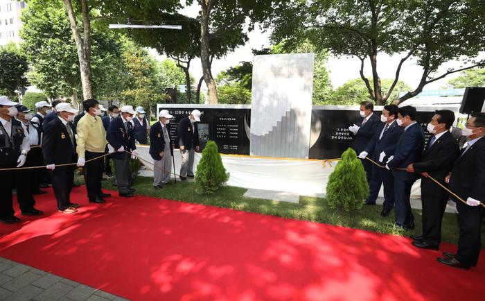 서울 강남구는 최근 개포동 수도전기공업고등학교 정문 인근에서 ‘6.25전쟁 참전 유공자 기념비 제막식’을 열었다. 이 기념비는 가로 7.4m, 높이 3m, 폭 2.6m의 조형물로 뒷면에는 한국전쟁에 참전한 구민 2193명의 이름이 새겨졌다. 사진은 제막식이 진행되고 있는 모습. (사진제공=강남구청)