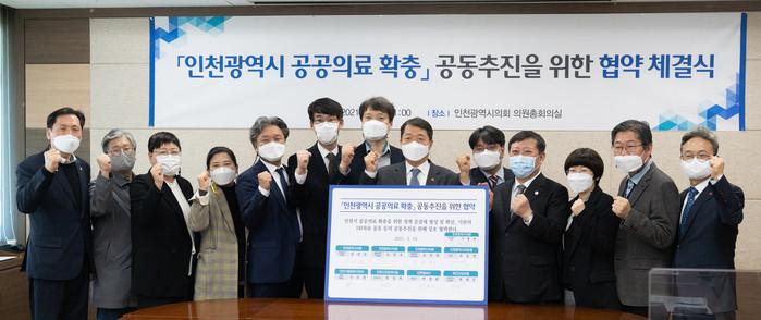 인천시의회가 최근 의원총회의실에서 인천의료원, 시민사회단체, 국민건강보험공단과 공공의료 확충을 위해 '인천광역시 공공의료 확충 공동추진을 위한 협약 체결식'을 열고 협약을 체결했다. 사진은 협약 후 관련 기관과 시민단체 관계자들이 기념 사진을 찍고 있는 모습. (사진제공=인천시의회)