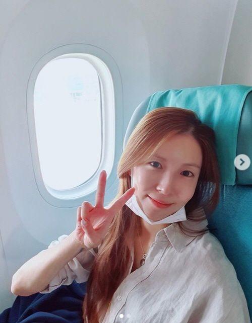 사진 속 보아는 비행기 안에서 미소를 지으며 브이 포즈를 하고 있다. 긴 생머리와 환하게 웃는 모습에서 청순함이 돋보인다.